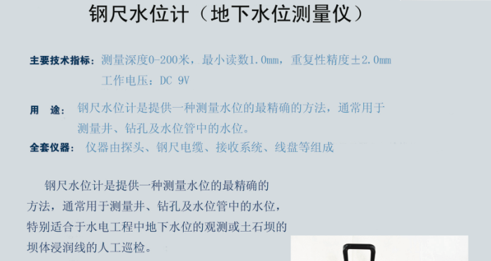 2、地面接收仪器--钢尺水位计,由测头,钢尺电缆,接收系统和绕线盘等组成。